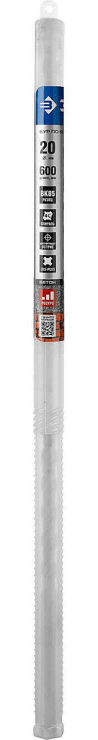Бур по бетону SDS Plus ЗУБР 29314-600-20_z01, для перфоратора, применяется при сверлении отверстий в бетоне, граните, кирпичной кладке, камне и твердых известняках. Конструкция головки бура из твердосплавной пластины ВК85 с двумя резцами и центрирующим наконечником для быстрого сверления. Геометрия наконечника в форме зубила для динамичного и агрессивного врезания в материал. Спираль 4S с усиленным сердечником обеспечивает оптимальное соотношение между устойчивостью к излому бура и быстрым отводом шлама, подавляет вибрацию и способствует лучшей передаче энергии удара непосредственно на твердосплавный резец.