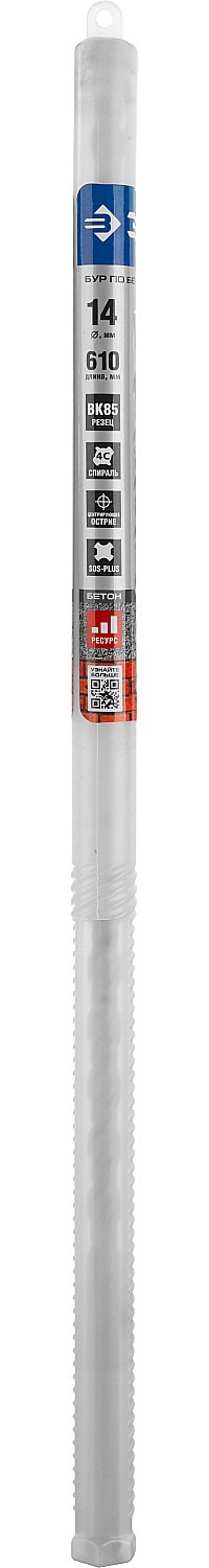 Бур по бетону SDS Plus ЗУБР 29314-610-14_z01, для перфоратора, применяется при сверлении отверстий в бетоне, граните, кирпичной кладке, камне и твердых известняках. Конструкция головки бура из твердосплавной пластины ВК85 с двумя резцами и центрирующим наконечником для быстрого сверления. Геометрия наконечника в форме зубила для динамичного и агрессивного врезания в материал. Спираль 4S с усиленным сердечником обеспечивает оптимальное соотношение между устойчивостью к излому бура и быстрым отводом шлама, подавляет вибрацию и способствует лучшей передаче энергии удара непосредственно на твердосплавный резец.