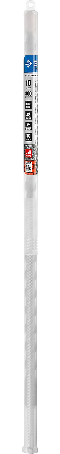 Бур по бетону SDS Plus ЗУБР 29314-800-10_z01, для перфоратора, применяется при сверлении отверстий в бетоне, граните, кирпичной кладке, камне и твердых известняках. Конструкция головки бура из твердосплавной пластины ВК85 с двумя резцами и центрирующим наконечником для быстрого сверления. Геометрия наконечника в форме зубила для динамичного и агрессивного врезания в материал. Спираль 4S с усиленным сердечником обеспечивает оптимальное соотношение между устойчивостью к излому бура и быстрым отводом шлама, подавляет вибрацию и способствует лучшей передаче энергии удара непосредственно на твердосплавный резец.