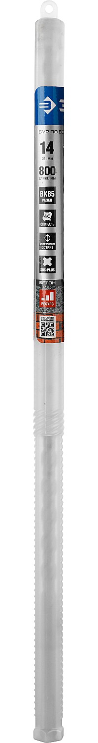 Бур по бетону SDS Plus ЗУБР 29314-800-14_z01, для перфоратора, применяется при сверлении отверстий в бетоне, граните, кирпичной кладке, камне и твердых известняках. Конструкция головки бура из твердосплавной пластины ВК85 с двумя резцами и центрирующим наконечником для быстрого сверления. Геометрия наконечника в форме зубила для динамичного и агрессивного врезания в материал. Спираль 4S с усиленным сердечником обеспечивает оптимальное соотношение между устойчивостью к излому бура и быстрым отводом шлама, подавляет вибрацию и способствует лучшей передаче энергии удара непосредственно на твердосплавный резец.