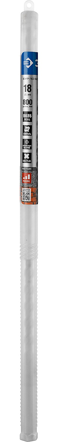 Бур по бетону SDS Plus ЗУБР 29314-800-18_z01, для перфоратора, применяется при сверлении отверстий в бетоне, граните, кирпичной кладке, камне и твердых известняках. Конструкция головки бура из твердосплавной пластины ВК85 с двумя резцами и центрирующим наконечником для быстрого сверления. Геометрия наконечника в форме зубила для динамичного и агрессивного врезания в материал. Спираль 4S с усиленным сердечником обеспечивает оптимальное соотношение между устойчивостью к излому бура и быстрым отводом шлама, подавляет вибрацию и способствует лучшей передаче энергии удара непосредственно на твердосплавный резец.