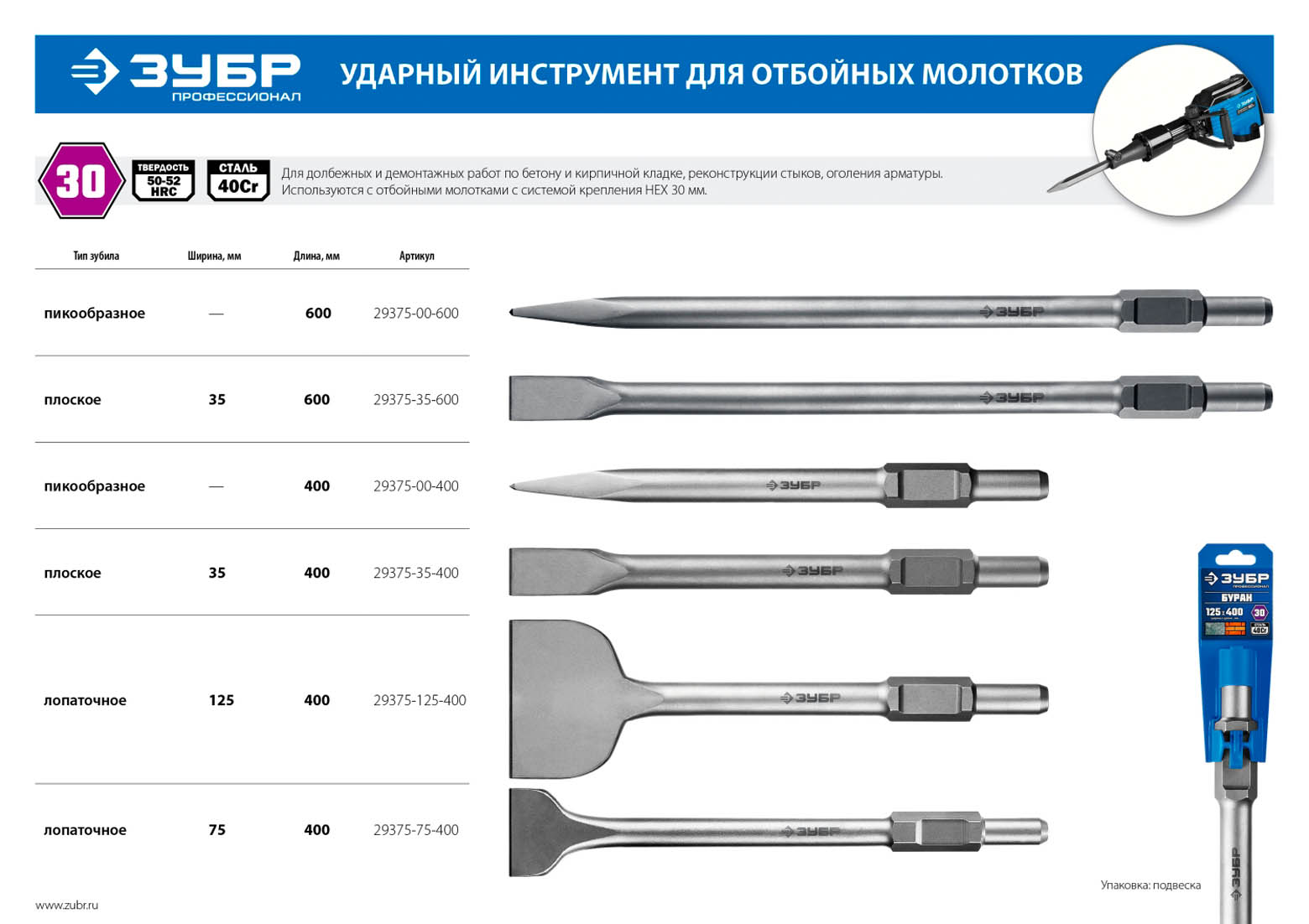 Зубило пикообразное 400 мм, HEX 30, ЗУБР 29375-00-400, предназначено для долбежных и демонтажных работ по бетону и кирпичной кладке, реконструкции стыков, оголения арматуры. Используется с ударными перфораторами с системой крепления НЕХ 28 мм. Индукционная трехступенчатая закалка со строгим соблюдением температур в каждой зоне при термообработке для повышения стойкости и увеличения рабочего ресурса инструмента. Высокопрочная легированная сталь гарантирует продолжительный срок службы инструмента. Высокая устойчивость по отношению к ударам и динамическим нагрузкам. Шлифованная круглая форма. Износостойкое покрытие, защищающее от коррозии.
