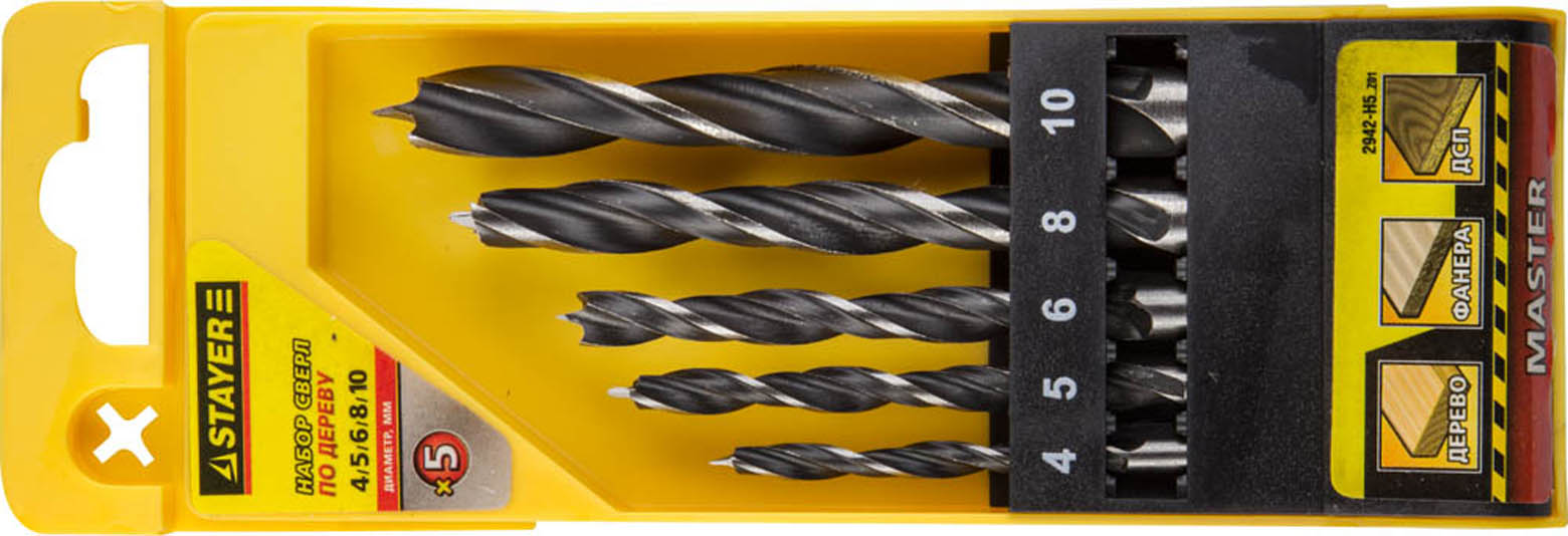 Набор сверл спиральных по дереву "M-type", 5шт(d=4-10мм), М-образная заточка, сталь HCS, STAYER Professional 2942-H5