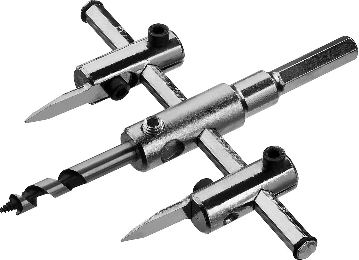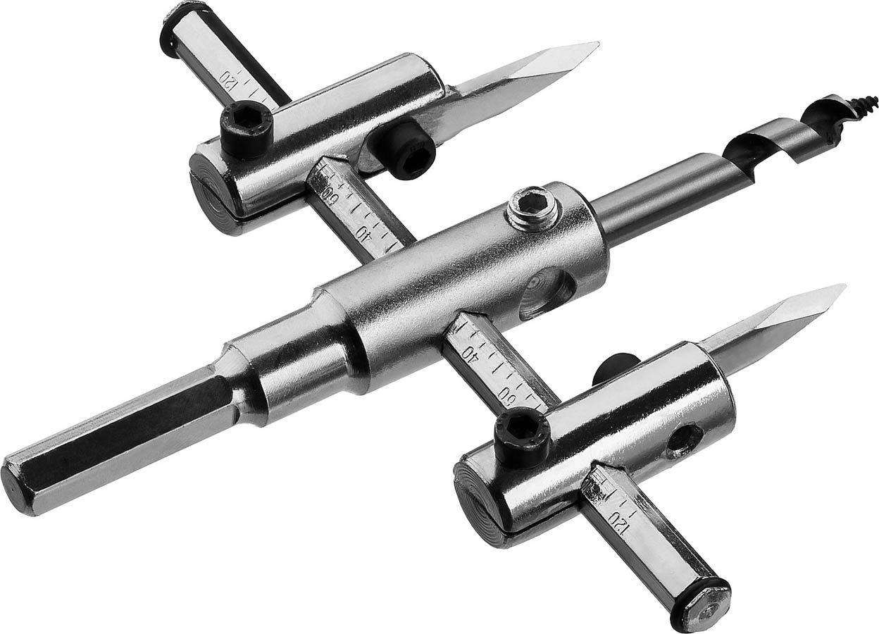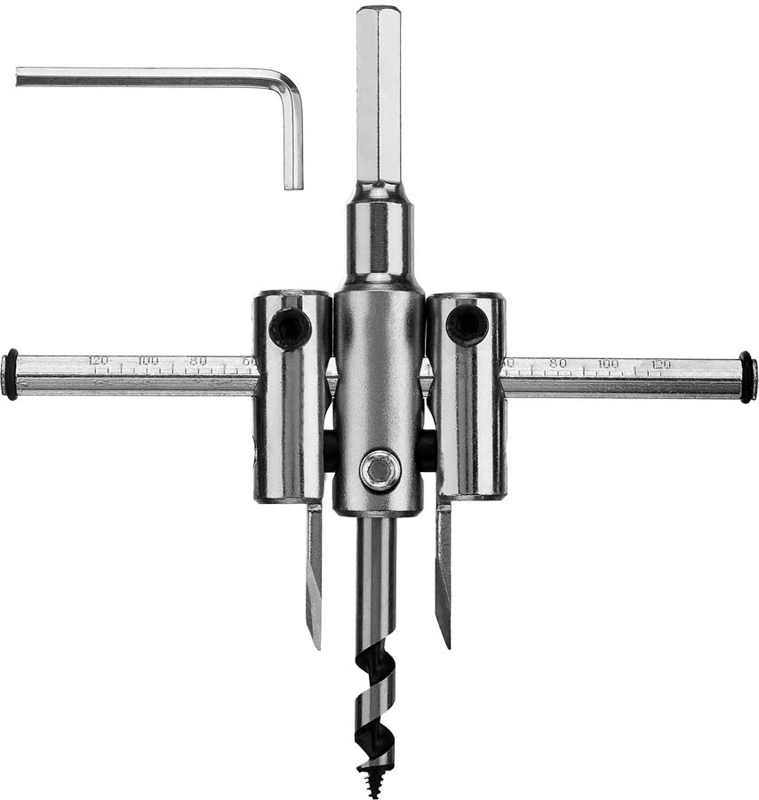 Сверло регулируемое 30-120 мм, ЗУБР 29440-120, применяется в безударном режиме на электрических дрелях и легких перфораторах мощностью не менее 750 Вт для сверления отверстий заданного диаметра в древесине, фанере и ДСП толщиной до 30 мм. Благодаря возможности замены режущих ножей на лезвия из твёрдого сплава представляется возможным обрабатывать такие материалы как гипсокартон, легкие пено- и газобетон, строительный кирпич. Шестигранный хвостовик, предотвращающий проскальзывание в патроне. Наличие размерной линейки на корпусе сверла. Наличие антикоррозионного покрытия.