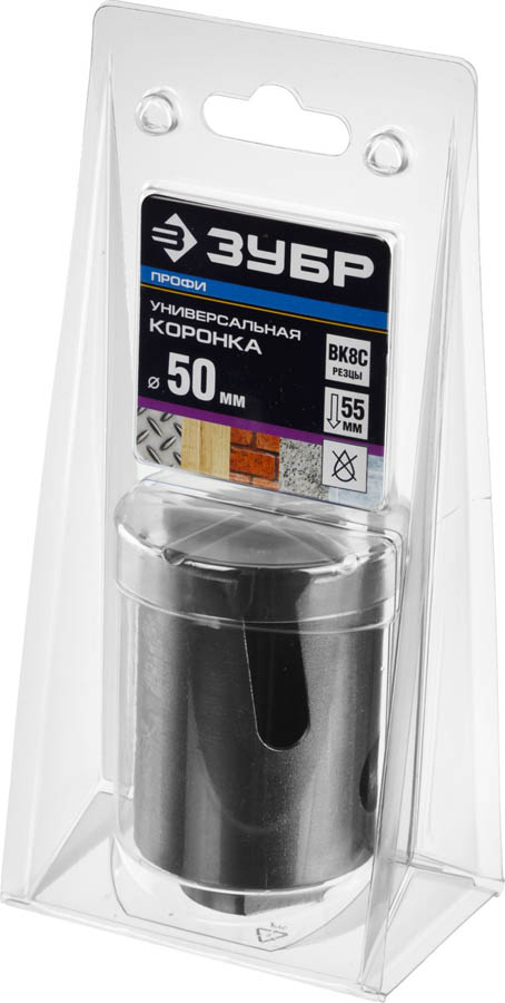 Коронка ЗУБР "ПРОФИ" "ПРОУНИВЕРСАЛ", твердосплав резцы, бетон, кирпич, керам, цв мет, гипсокарт, пласт, дерево, d=50мм