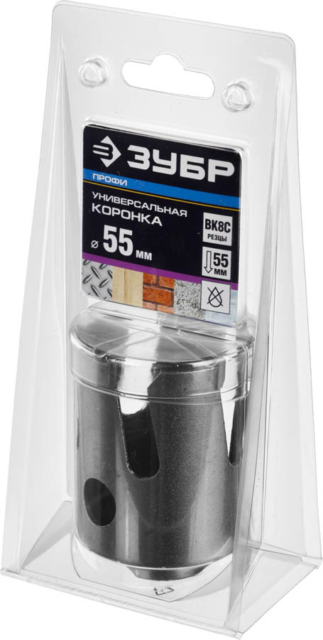 Коронка ЗУБР "ПРОФИ" "ПРОУНИВЕРСАЛ", твердосплав резцы, бетон, кирпич, керам, цв мет, гипсокарт, пласт, дерево, d=55мм