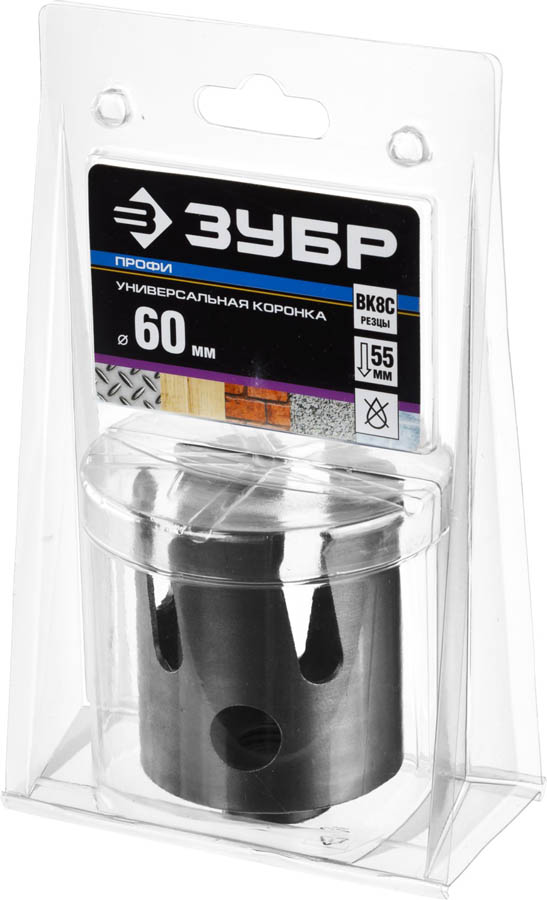 Коронка ЗУБР "ПРОФИ" "ПРОУНИВЕРСАЛ", твердосплав резцы, бетон, кирпич, керам, цв мет, гипсокарт, пласт, дерево, d=60мм