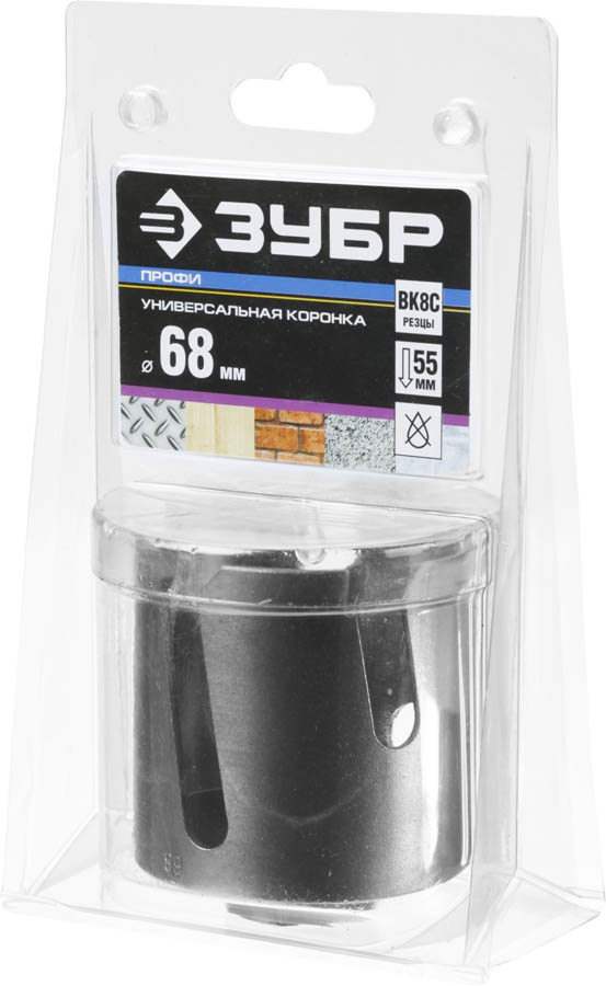 Коронка ЗУБР "ПРОФИ" "ПРОУНИВЕРСАЛ", твердосплав резцы, бетон, кирпич, керам, цв мет, гипсокарт, пласт, дерево, d=68мм