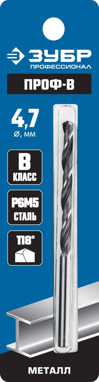 Сверло по металлу Проф-В, класс В, Р6М5, ЗУБР Профессионал 29621-4.7, d=4,7 мм