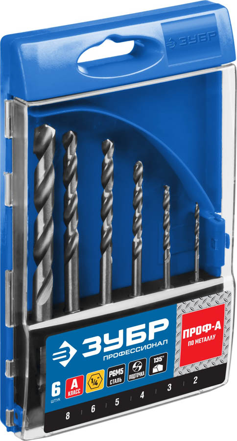 Набор сверл по металлу 6 шт (d=2-8 мм), НЕХ 1/4", шестигранный хвостовик, класс A, сталь Р6М5, ЗУБР Профессионал 29623-H6