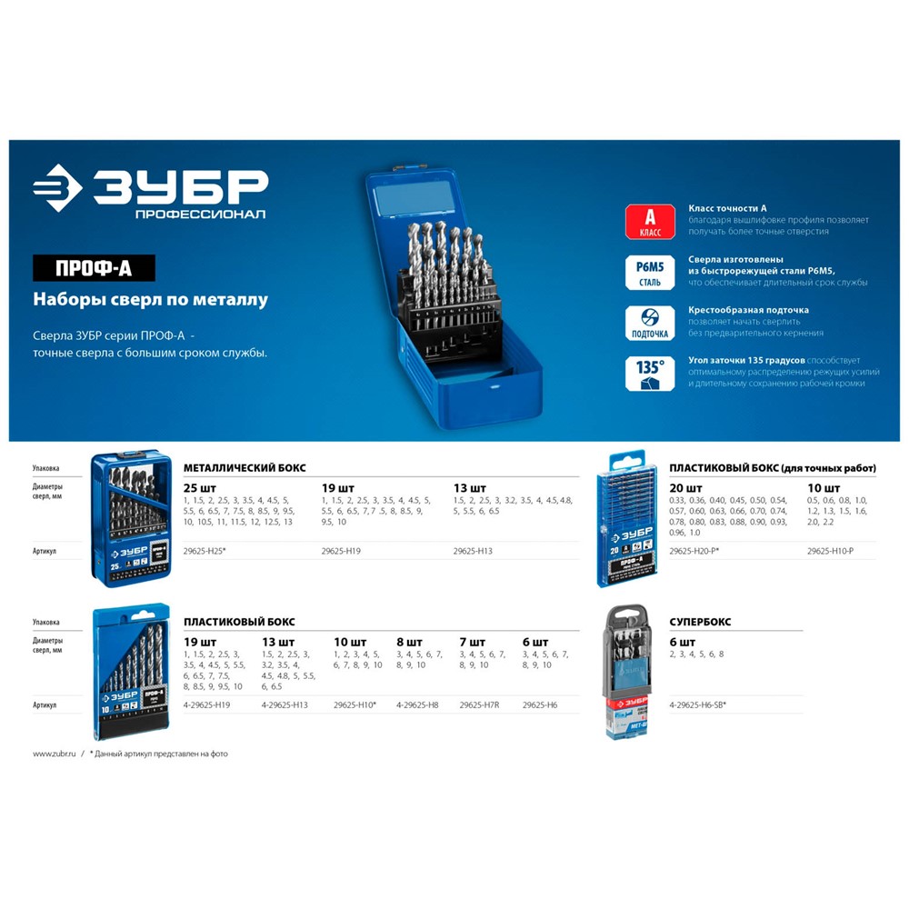 Набор сверел Зубр 29625-H10-P, предназначен для обработки легированных и углеродистых сталей с пределом прочности до 900Н/мм2, цветных металлов, серого чугуна и пластмассы. Качественное и точное сверло с большим ресурсом. Сверло изготовлено методом шлифования профиля по ГОСТ 10902-77 и соответствует классу точности сверления "А1". Крестообразная подточка позволяет начать сверлить без предварительного кернения. Угол заточки при вершине равный 135° повышает производительность работ.