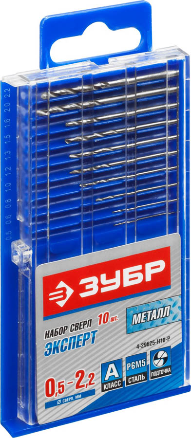 Набор сверл по металлу 10 шт (d=0,5-2,2 мм), Проф-А, класс А, сталь Р6М5, ЗУБР Профессионал 29625-H10-P