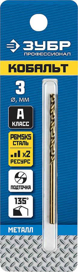 Сверло по металлу КОБАЛЬТ, сталь Р6М5К5, класс А, ЗУБР Профессионал 29626-3, d=3 мм