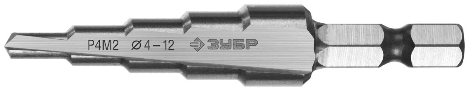 Сверло ЗУБР "МАСТЕР" ступенчатое по сталям и цвет.мет., быстрорежущая сталь, d=4-12мм, 5ступ.d=4-6-8-10-12, L-65мм, шестигран.хвост.1/4"