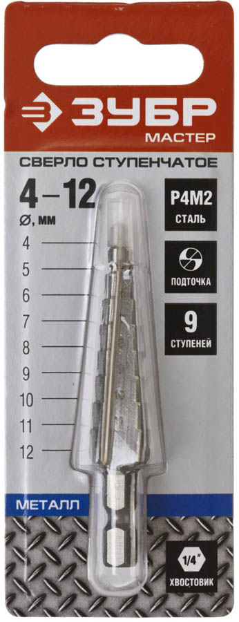 Сверло ЗУБР "МАСТЕР" ступенчатое по сталям и цвет.мет., быстрорежущая сталь, d=4-12мм, 9ступ.d=4-12, L- 65 мм,шестигран. хвост.1/4"
