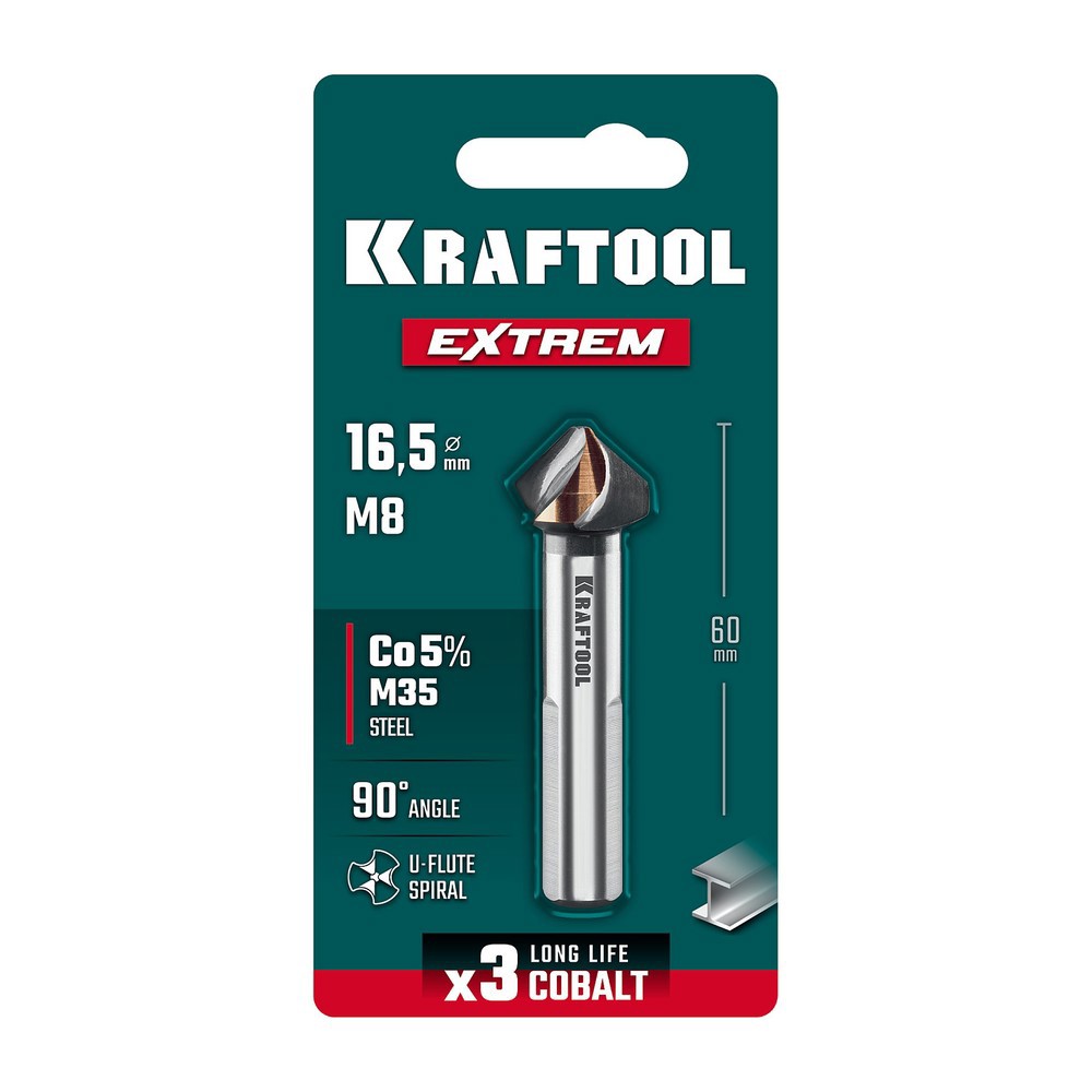 KRAFTOOL EXTREME Со5-А, d 16.5 х 60 мм, сталь M35, U-образная спираль, для раззенковки М8, Конусный зенкер (29734-8)