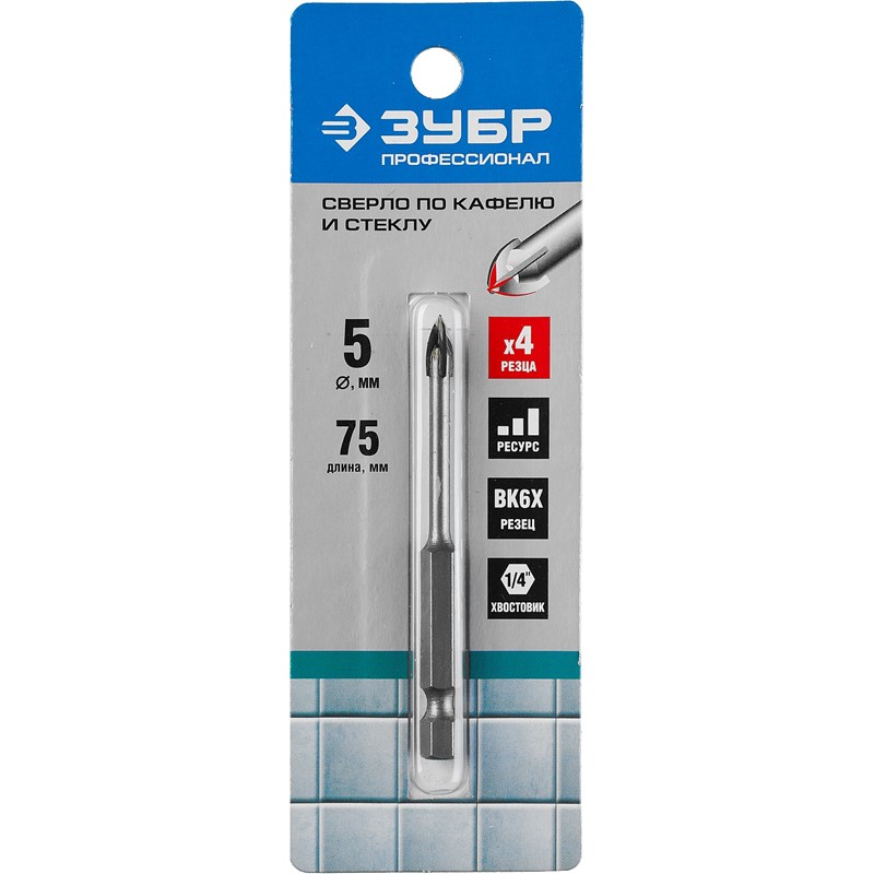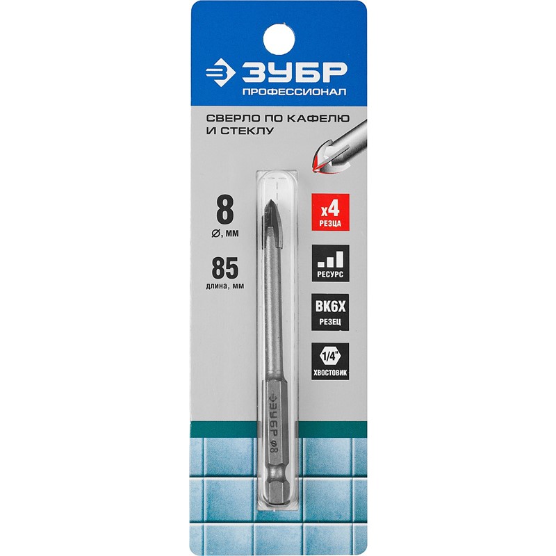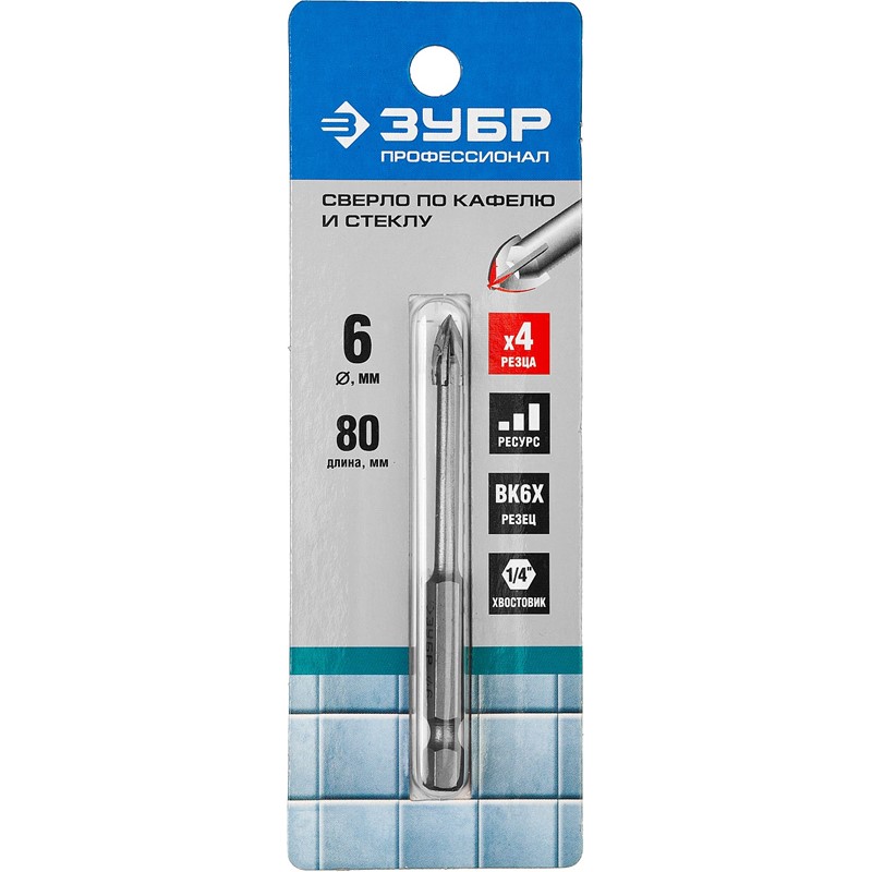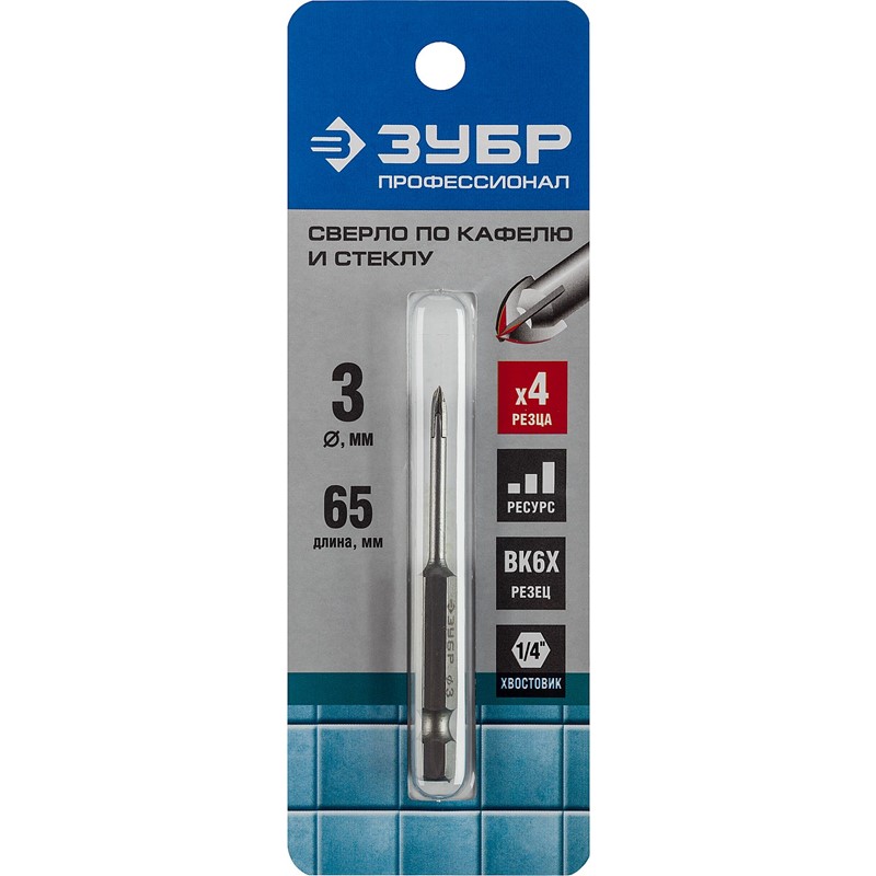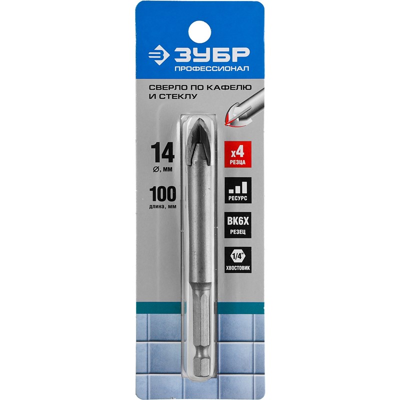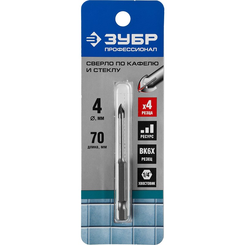 Сверло по кафелю, керамике, стеклу, с четырьмя режущими лезвиями, шестигранный хвостовик, 10 мм, ЗУБР ″ЭКСПЕРТ″ 29845-10
