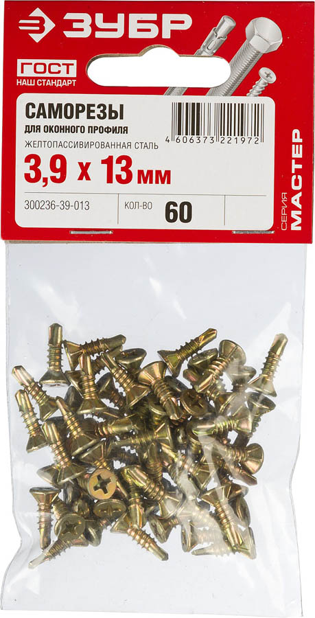ЗУБР 13 х 3.9 мм, 60 шт., саморезы для оконного профиля 300236-39-013