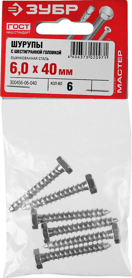 ЗУБР 40 х 6 мм, 6 шт., шурупы с шестигранной головкой (DIN 571) 300456-06-040