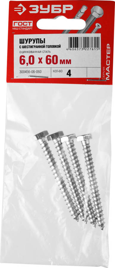 ЗУБР 60 х 6 мм, 4 шт., шурупы с шестигранной головкой (DIN 571) 300456-06-060