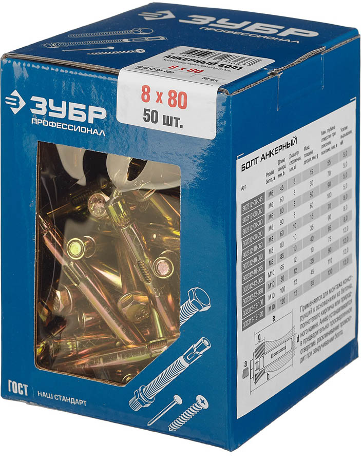 ЗУБР 8x80 мм, 50 шт., желтопассивированный, болт анкерный 302312-08-080