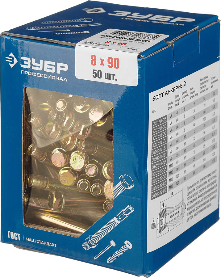 ЗУБР 8x90 мм, 50 шт., желтопассивированный, болт анкерный 302312-08-090