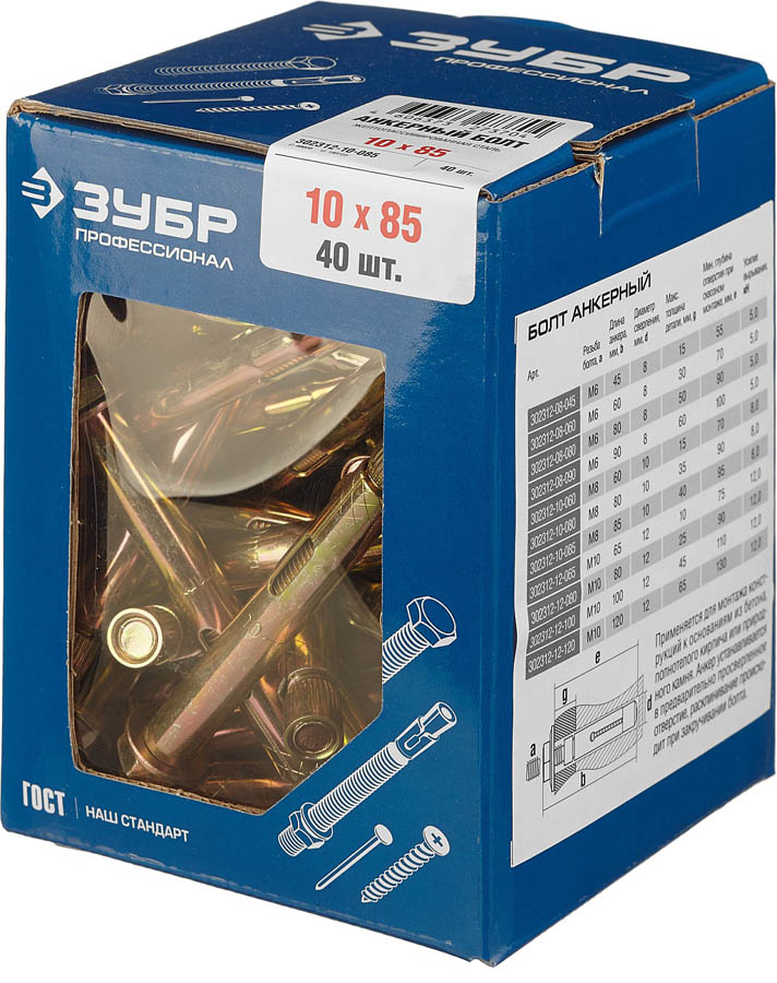 ЗУБР 10x85 мм, 40 шт., желтопассивированный, болт анкерный 302312-10-085