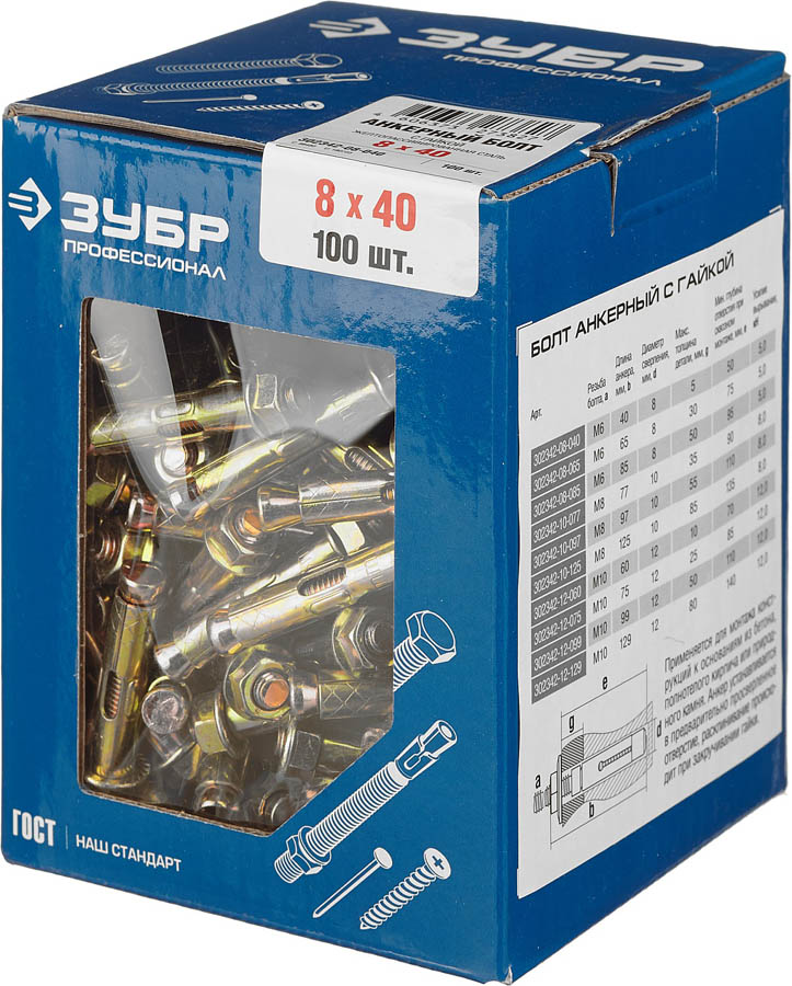 Анкерный болт ЗУБР 302342-08-040, предназначен для крепления различных материалов к бетону или природному камню. Крепление осуществляется при помощи болта.
