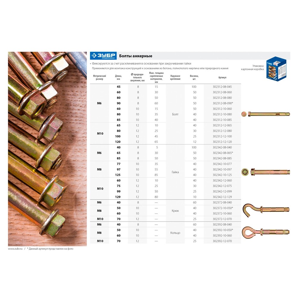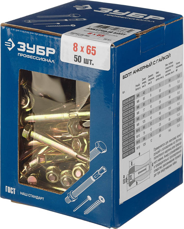 Анкерный болт ЗУБР 302342-08-065, предназначен для крепления различных материалов к бетону или природному камню. Крепление осуществляется при помощи болта.