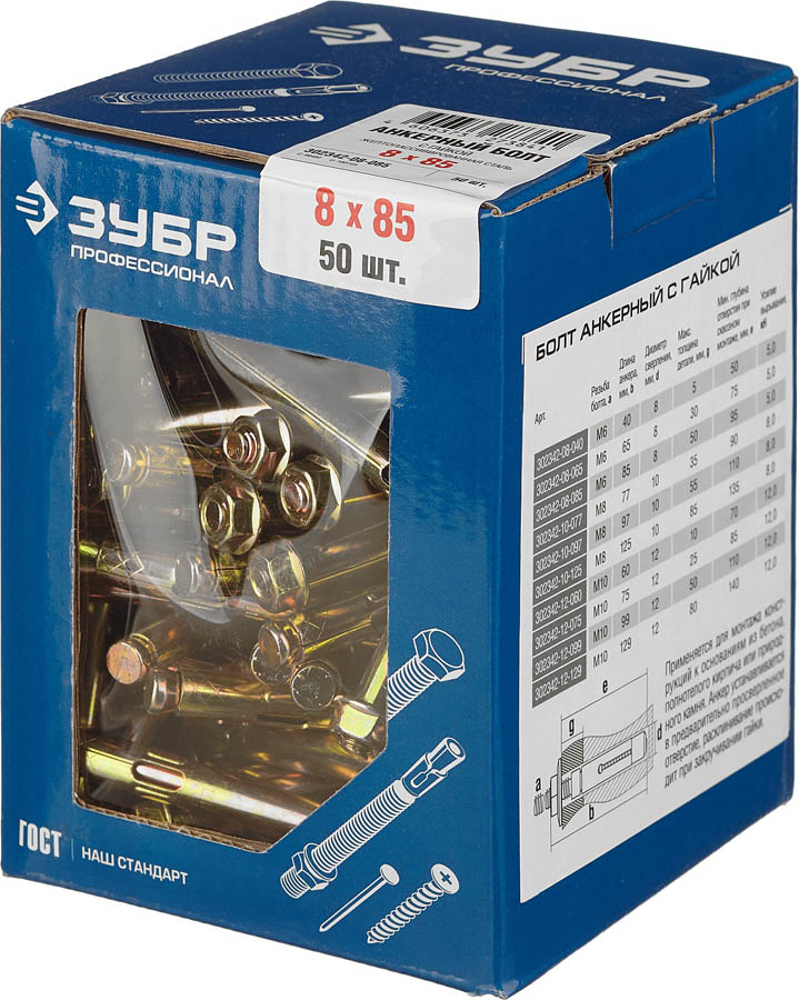 ЗУБР 8x85 мм, 50 шт., желтопассивированный, болт анкерный с гайкой 302342-08-085