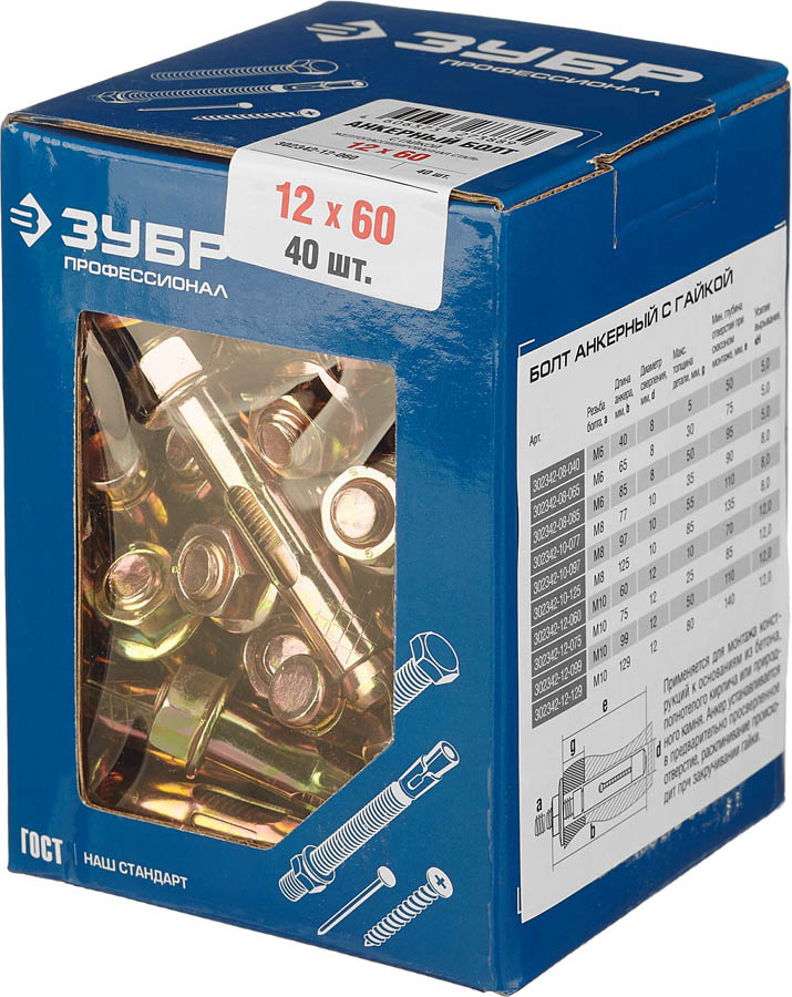 ЗУБР 12x60 мм, 40 шт., желтопассивированный, болт анкерный с гайкой 302342-12-060