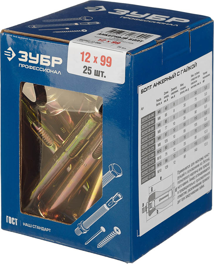 ЗУБР 12x99 мм, 25 шт., желтопассивированный, болт анкерный с гайкой 302342-12-099
