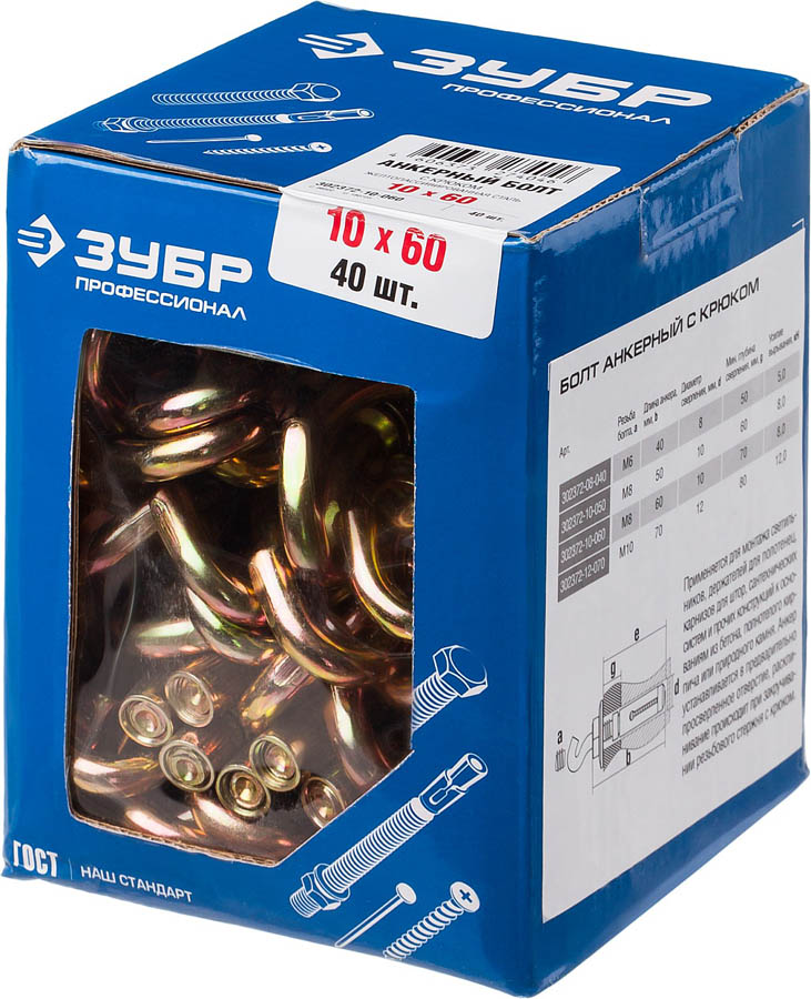 ЗУБР 10x60 мм, 40 шт., желтопассивированный, болт анкерный с крюком 302372-10-060