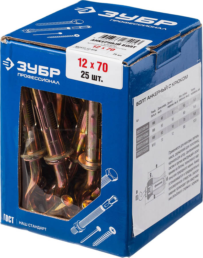 ЗУБР 12x70 мм, 25 шт., желтопассивированный, болт анкерный с крюком 302372-12-070