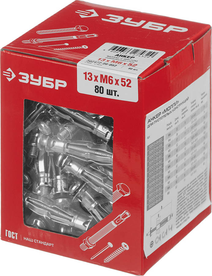 ЗУБР 80 шт., М6х52х13 мм, оцинкованный, анкер МОЛЛИ для пустотелых конструкций 302472-06-052