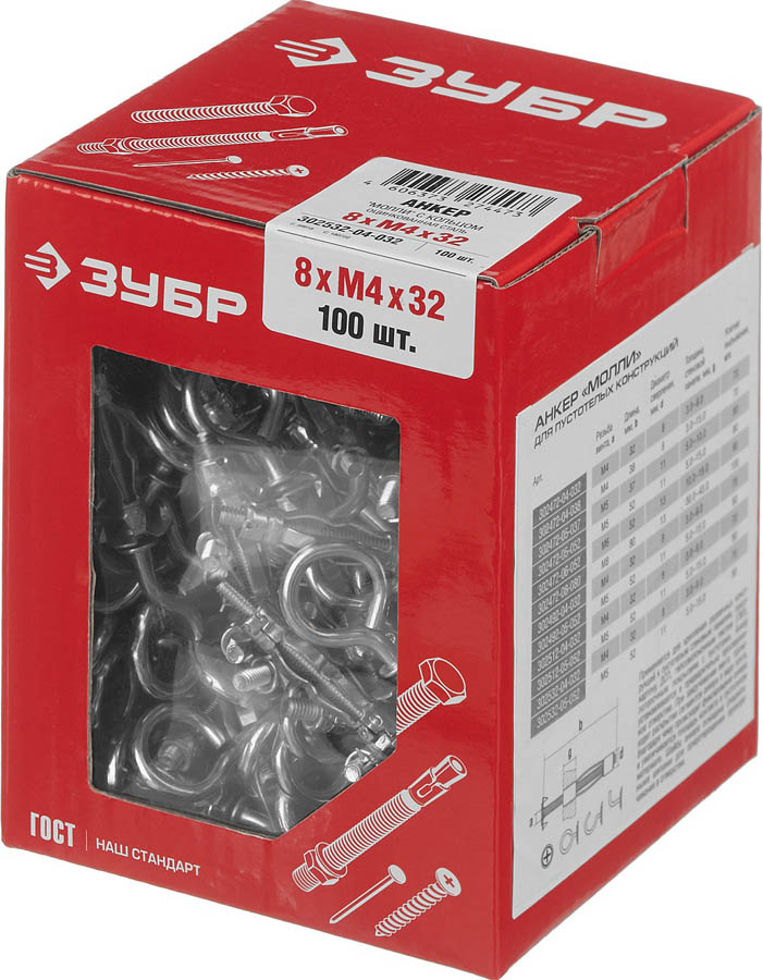 ЗУБР 100 шт., М4х32х8 мм, оцинкованный, с кольцом, анкер МОЛЛИ для пустотелых конструкций 302532-04-032