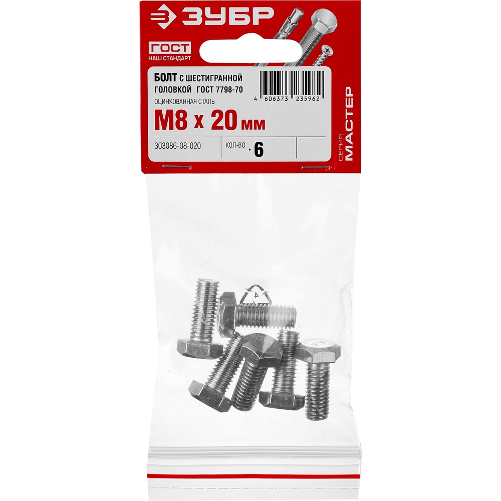 Болт ГОСТ 7798-70, M8 x 20 мм, 6 шт, кл. пр. 5.8, оцинкованный, ЗУБР