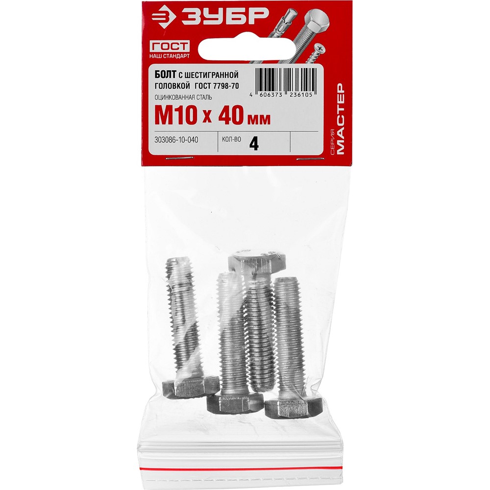 Болт ГОСТ 7798-70, M10 x 40 мм, 4 шт, кл. пр. 5.8, оцинкованный, ЗУБР
