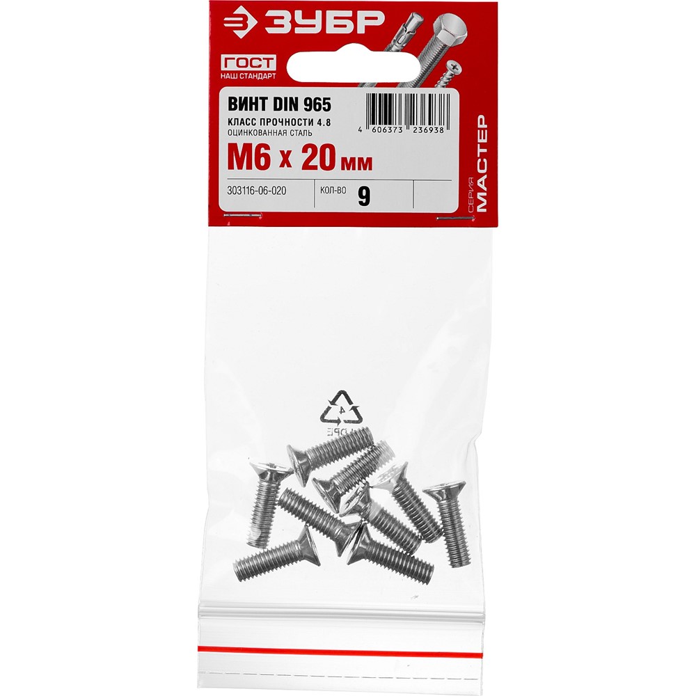 Винт DIN 965, M6 x 20 мм, 9 шт, кл. пр. 4.8, оцинкованный, ЗУБР
