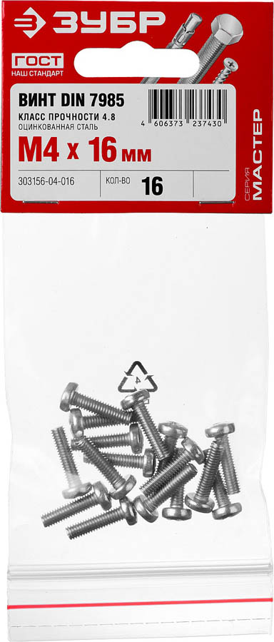 Винт DIN 7985 M4x16мм, 16шт, кл. пр. 4.8, оцинкованный, ЗУБР