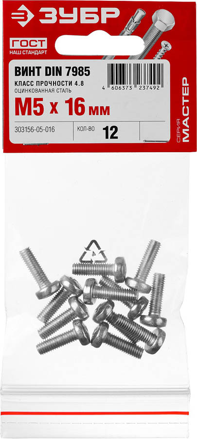 Винт DIN 7985 M5x16мм, 12шт, кл. пр. 4.8, оцинкованный, ЗУБР