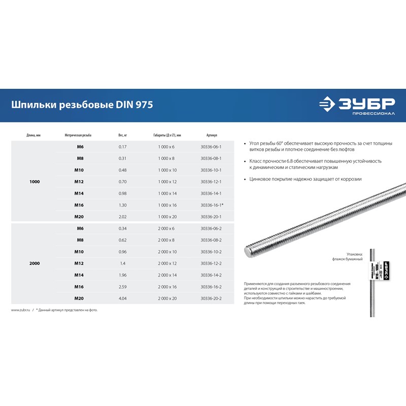| 30336-14-1 | М14 | 1000 | DIN 975 | 6.8 | сталь | Цинковое | 1 |