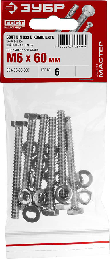 Болт (DIN933) в комплекте с гайкой (DIN934), шайбой (DIN125), шайбой пруж. (DIN127), M6 x 60 мм, 6 шт, ЗУБР