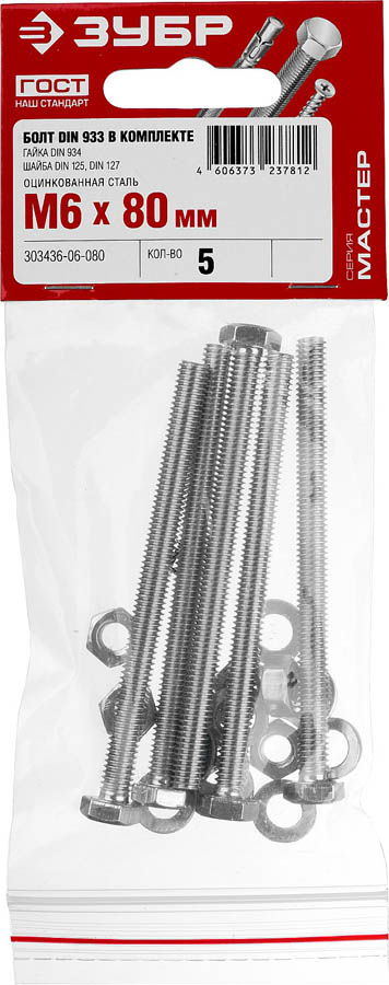 Болт (DIN933) в комплекте с гайкой (DIN934), шайбой (DIN125), шайбой пруж. (DIN127), M6 x 80 мм, 5 шт, ЗУБР