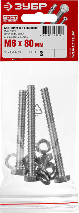Болт (DIN933) в комплекте с гайкой (DIN934), шайбой (DIN125), шайбой пруж. (DIN127), M8 x 80 мм, 3 шт, ЗУБР