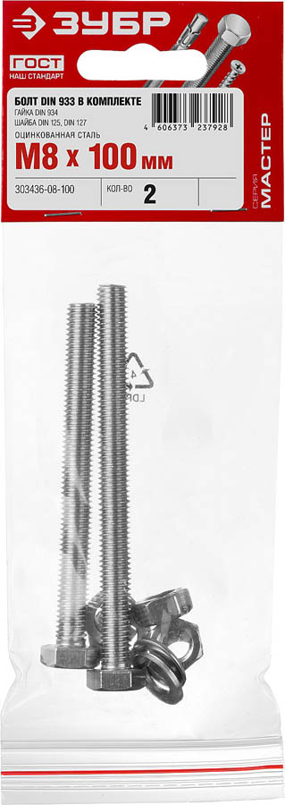 Болт (DIN933) в комплекте с гайкой (DIN934), шайбой (DIN125), шайбой пруж. (DIN127), M8 x 100 мм, 2 шт, ЗУБР