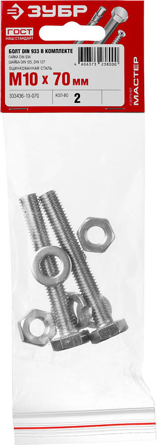 Болт (DIN933) в комплекте с гайкой (DIN934), шайбой (DIN125), шайбой пруж. (DIN127), M10 x 70 мм, 2 шт, ЗУБР