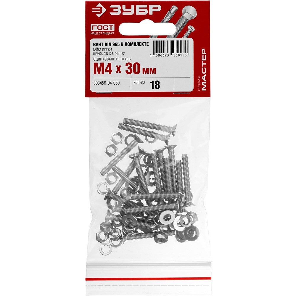 Винт (DIN965) в комплекте с гайкой (DIN934), шайбой (DIN125), шайбой пруж. (DIN127), M4 x 30 мм, 18 шт, ЗУБР