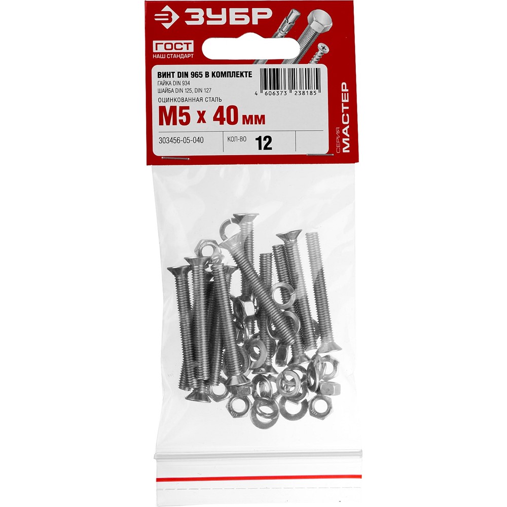 Винт (DIN965) в комплекте с гайкой (DIN934), шайбой (DIN125), шайбой пруж. (DIN127), M5 x 40 мм, 12 шт, ЗУБР