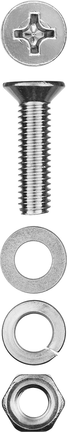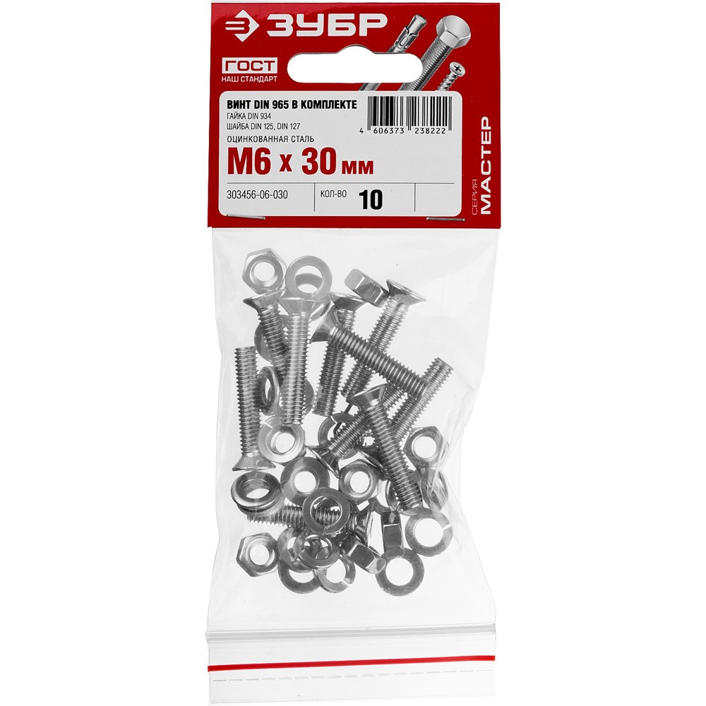 Винт (DIN965) в комплекте с гайкой (DIN934), шайбой (DIN125), шайбой пруж. (DIN127), M6 x 30 мм, 10 шт, ЗУБР